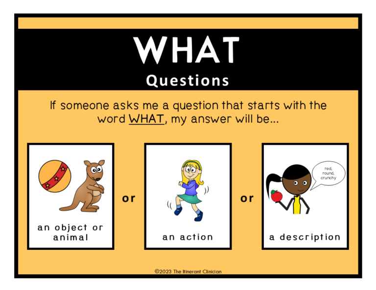 Once your student understands how to answer WH questions, it’s time to begin targeted instruction and practice. Based on your student’s needs, choose an appropriate flashcard set and start teaching WH questions for speech therapy in a structured, intentional way.